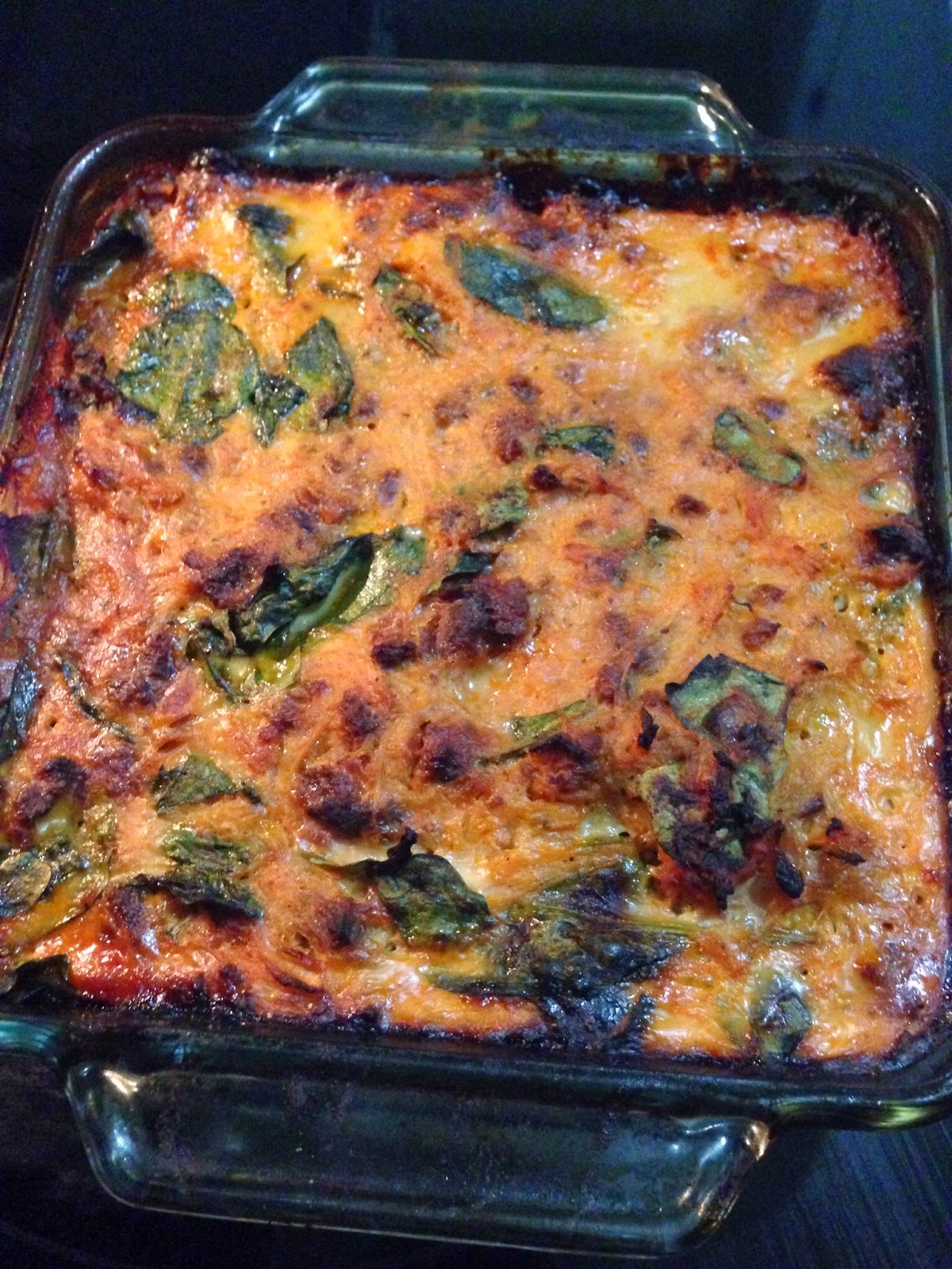 This recipe is adapted from a paleomg.com one... I made it spicier, added spinach, changed a few other things and will share the best and easiest way to cook spaghetti squash! It's fool proof, easy, fast, and never turns out wet.