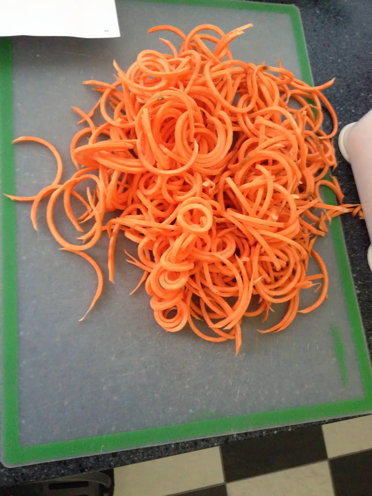 My mom has always been my valentine. She is the one love in my life that I know will never go away. This year she gave my a spiralizer. If you don't own one or know what it is you need to! It is a way to turn vegetables into noodles. I have made a cold cucumber "noodle" salad with it, zucchini noodles, sweet potato curly fries... this thing is awesome! She got mine at William Sonoma for less than $40. This recipe uses sweet potatoes to make the noodles, if you don't have the gadget you could use spaghetti squash, or a peeler to make threads of potato then cut them into smaller "noodles".