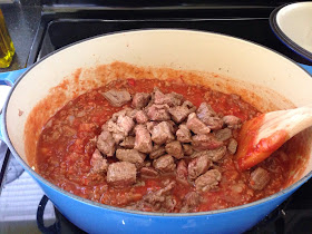 3. When the beef is browned add the remaining ingredients including the stew beef. Simmer over low heat for at least 3 hours stirring occasionally.