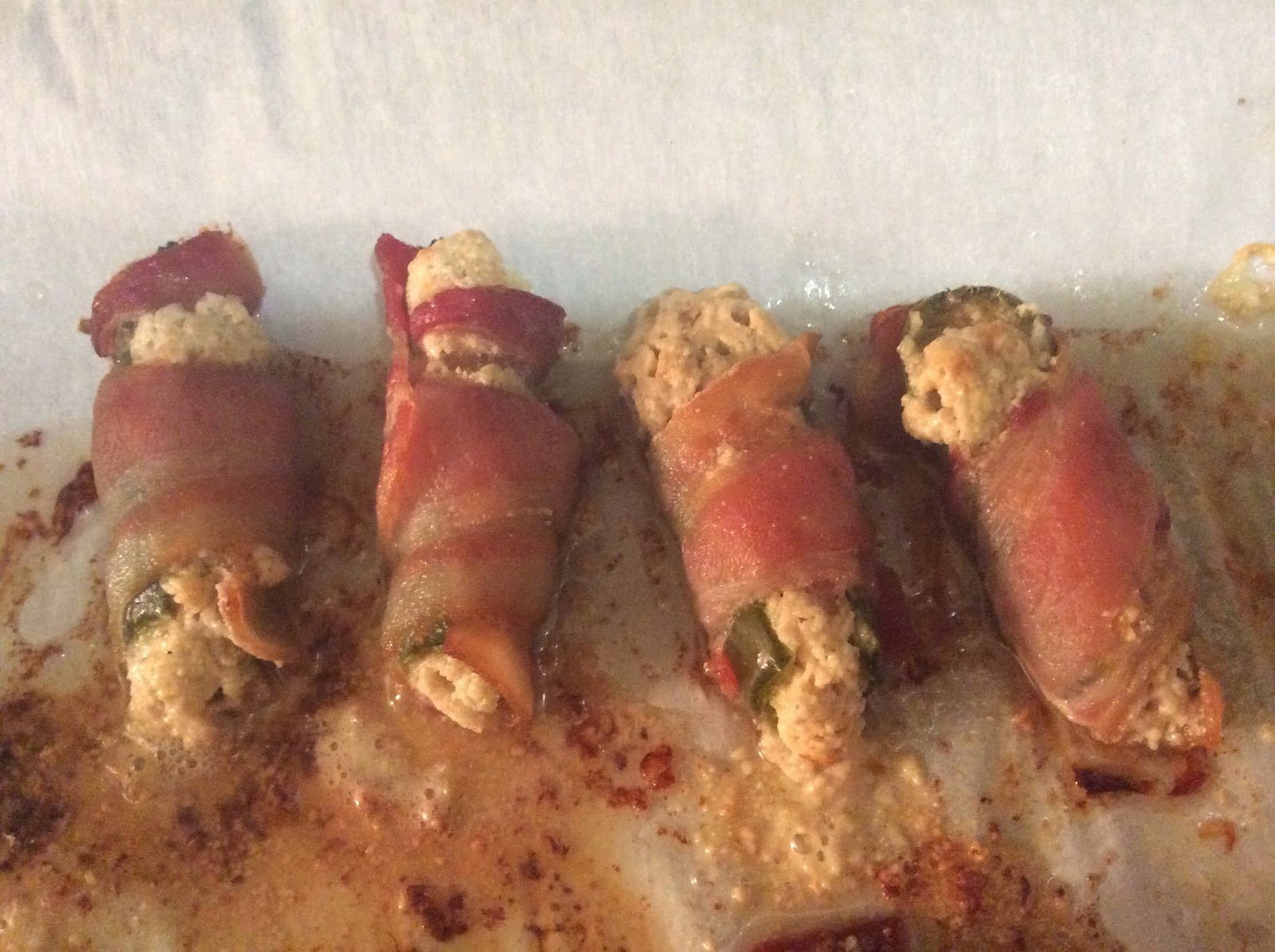 I used homemade cashew "cheese" as the filling and it expands when you bake them so go easy on the filling. I also used a half slice of bacon per popper but you could easily use a whole piece, I had small peppers. Don't expect it to taste like the cream cheese you are used to, but the almost sweet flavor when they are baked with the spicy jalapeno is heavenly.