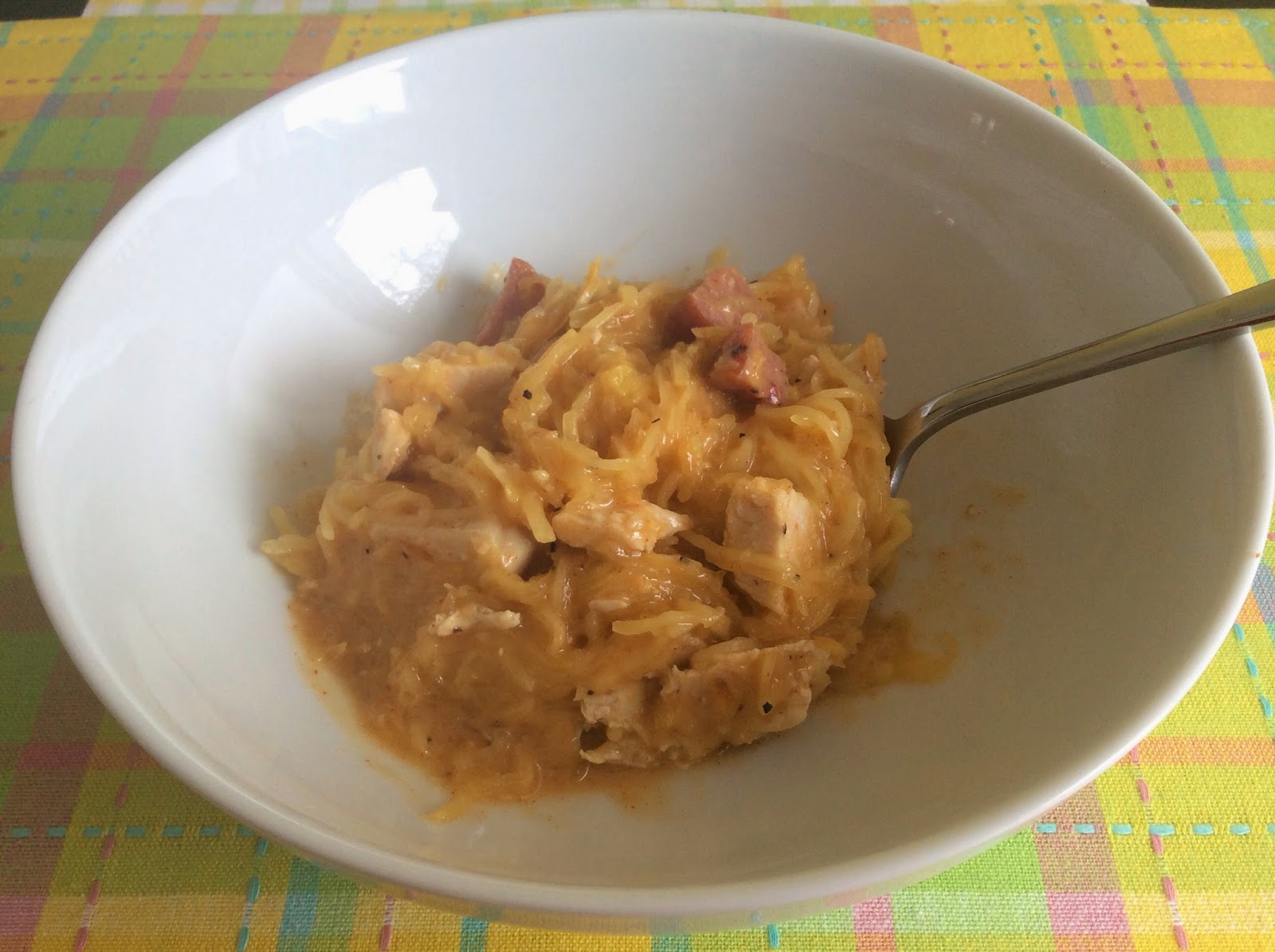 I roasted my spaghetti squash for the recipe because although my cheating microwave method is faster, it is honestly tastier roasted.