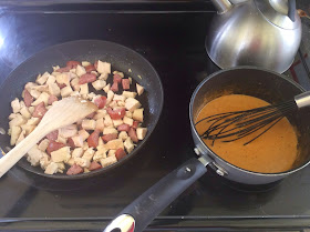 I started by cooking a 1lb chicken breast in a skillet over medium heat with a little oil. When the chicken was cooking I chopped up one smoked sausage I picked up from a local vender. Chorizo would be fantastic in this though. I added the smoked sausage to the pan and let the chicken cook through. While that was happening I started my sauce.