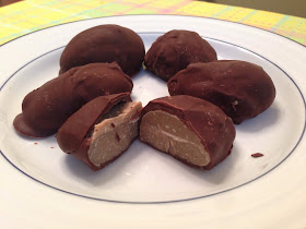 3. Melt the chocolate over a double boiler. Using two forks, roll the eggs in the chocolate and place them back on the cookie sheet. Then back in the freezer they go for another half hour or until you want to eat them!