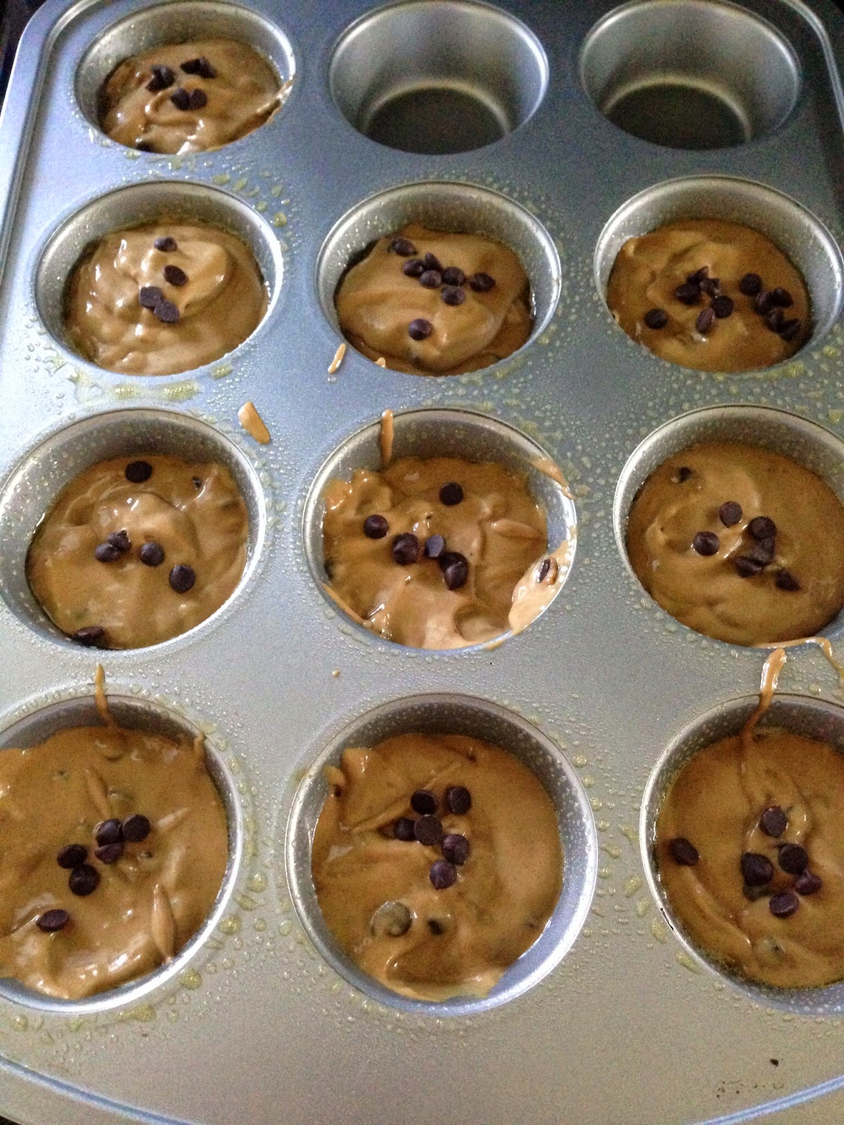 2. Grease a muffin pan (makes 9-10 normal muffins, 20ish minis) and fill 2/3 full.