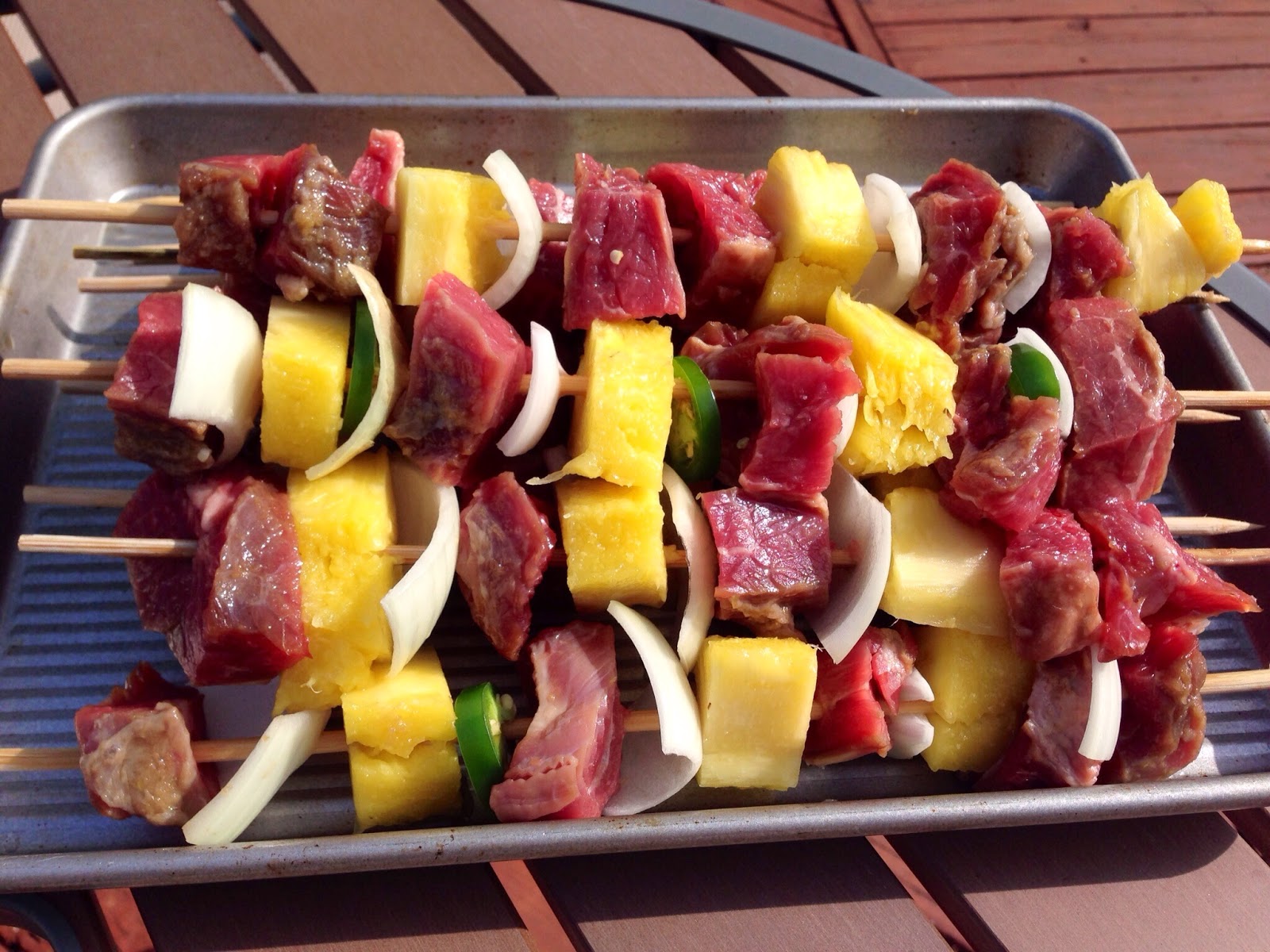 2. Slice the steak into cubes. Alternate onion, jalapeno, pineapple and steak on a skewer... in using wood skewers soak over night! This makes 8-10 kabobs.