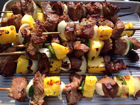 2. Slice the steak into cubes. Alternate onion, jalapeno, pineapple and steak on a skewer... in using wood skewers soak over night! This makes 8-10 kabobs.