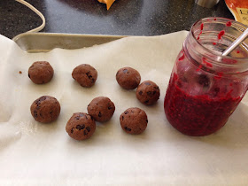 I hate my food processor. I bought it in college when I had no money, the lid is broken, it doesn't work well and it is just one of the pieces of kitchen equipment I need to replace. I avoid using it, but today I was up early making Alex's birthday "cake" and had to break it out. Alex is my sister's boyfriend. I was skeptical of him at first because she my other half and I am protective. We had a rocky start where he was acting his age and I was not acting mine, but it's a year later now and it turns out he's an ok guy. Mara can't bake so I made him the PaleOMG Raw Chocolate Chip Cheesecake Bars he wanted. The entire recipe is done with the food processor so since I had the stupid thing out I decided to make something else with it. Alex also liked these "bites" I made for a competition that were oatmeal, chia seeds, nut butter, etc. Yes, please call them "bites" not "balls"... at a box where words like "snatch" get thrown around the connotation can be easily changed- it would be in your best interest. :) Anyway! Since the the original "bites" weren't paleo I decided to mess around with ingredients and make a version of them. After some not so-good attempts I finally figured it out and these things are delicious- I would probably double the recipe!