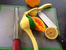 2. While the potatoes are baking, make the glaze. In a skillet over medium-high heat, zest 1/2 the orange and 1/2 the lemon. Juice both of them into the skillet- Measurements here don't need to be perfect- however much juice they have is fine. Add the remaining ingredients and bring to a boil. Reduce the heat and simmer until the sauce has reduced to a glaze.