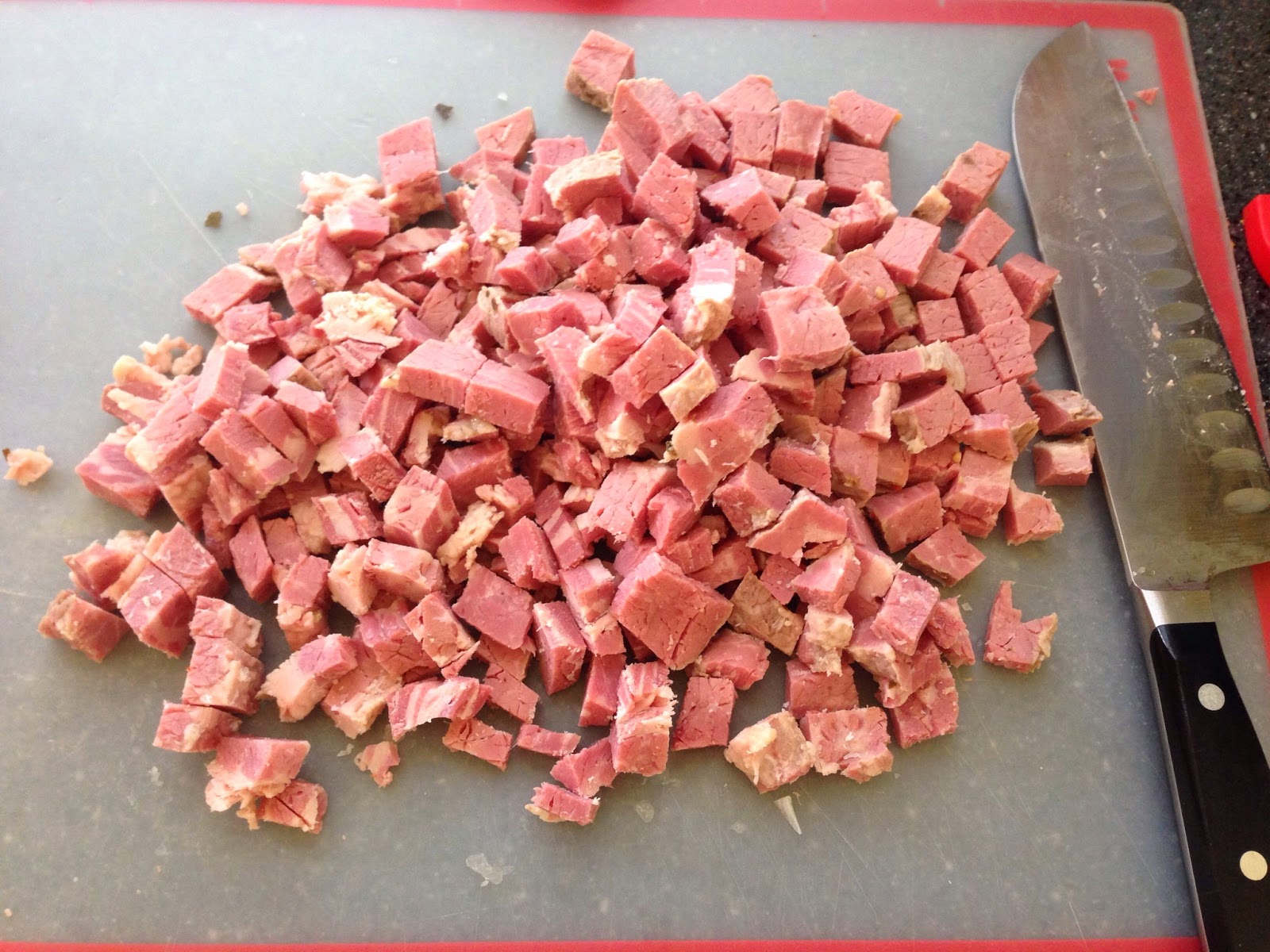 You can do this one of two ways... one, buy a brisket and let it sit in a brine for 24hour to 4 days and then cook the beef... or two, buy corned beef already brined and cook it. I did the lather because I didn't want to wait. I found my corned beef at Whole Foods and cooked it 30 min per pound in water, in my dutch oven. I then sliced and cubed it for the hash. Charlie LOVED the corned beef... when I was cubing it she was eating it almost as fast... it is definitely going on my menu of things to have on hand.