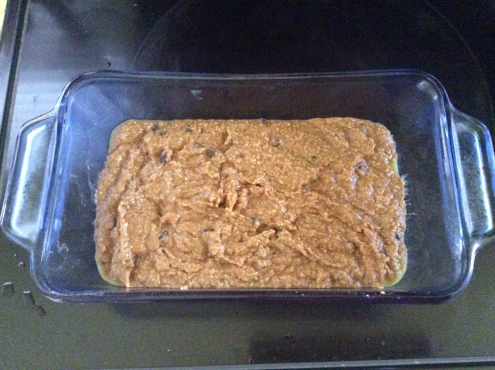 5. Pour into a greased bread pan. Bake 45-50 min until a toothpick inserted in the middle comes out clean. Cool at least 10 min before cutting.