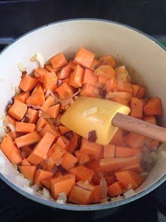 I used to have a recipe website under Ree Drumond's (Pioneer Woman) website "Tasty Kitchen." It was when I was a vegetarian and I had forgotten how good some of my recipes there were. I was looking through them this weekend and this is a recipe I thought would be great for this time of year since sweet potatoes are on sale and the weather has been getting colder putting me in a soup mood. Charlie won't eat this one because she apparently only eats Roasted Red Pepper soup, but she did me the honor of trying it. It is SPICY compared to most soups so if you aren't a fan of that, ease back on the chipotle peppers. I topped mine with a little parsley, and packed it for lunches this week with some cold cuts and raw cheese. I am now thinking I will make some crispy bacon tonight, chop it up, and top my soup with that.... I'm excited already.
