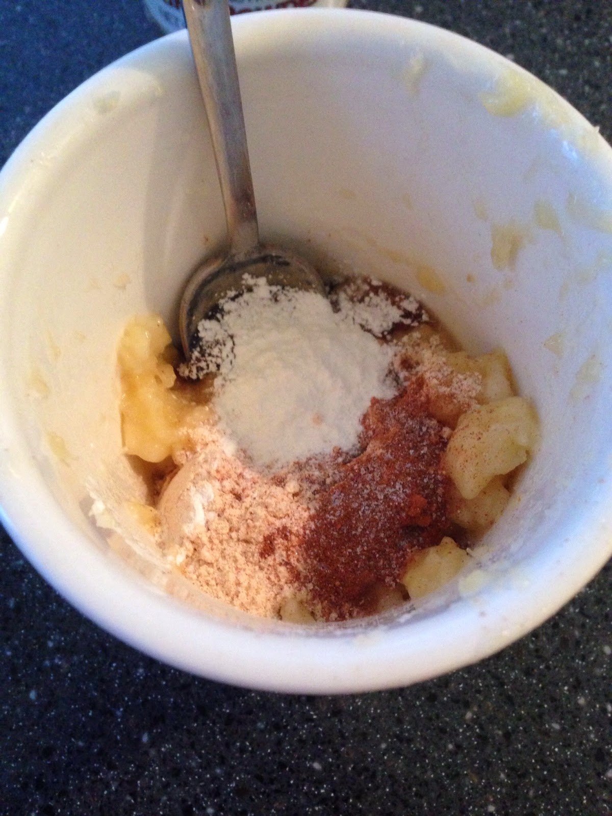 1. Mix everything in a microwave safe mug. Microwave for 2-3 minutes until it is pulling away from the sides. Enjoy!