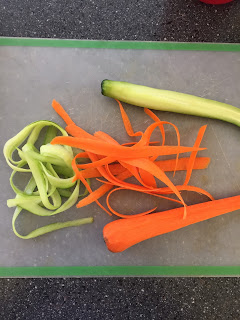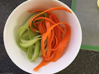 2. Fake pickle your cucumber and carrot.... using a vegetable peeler or mandolin, shred the carrots and cucumber into thin strips.