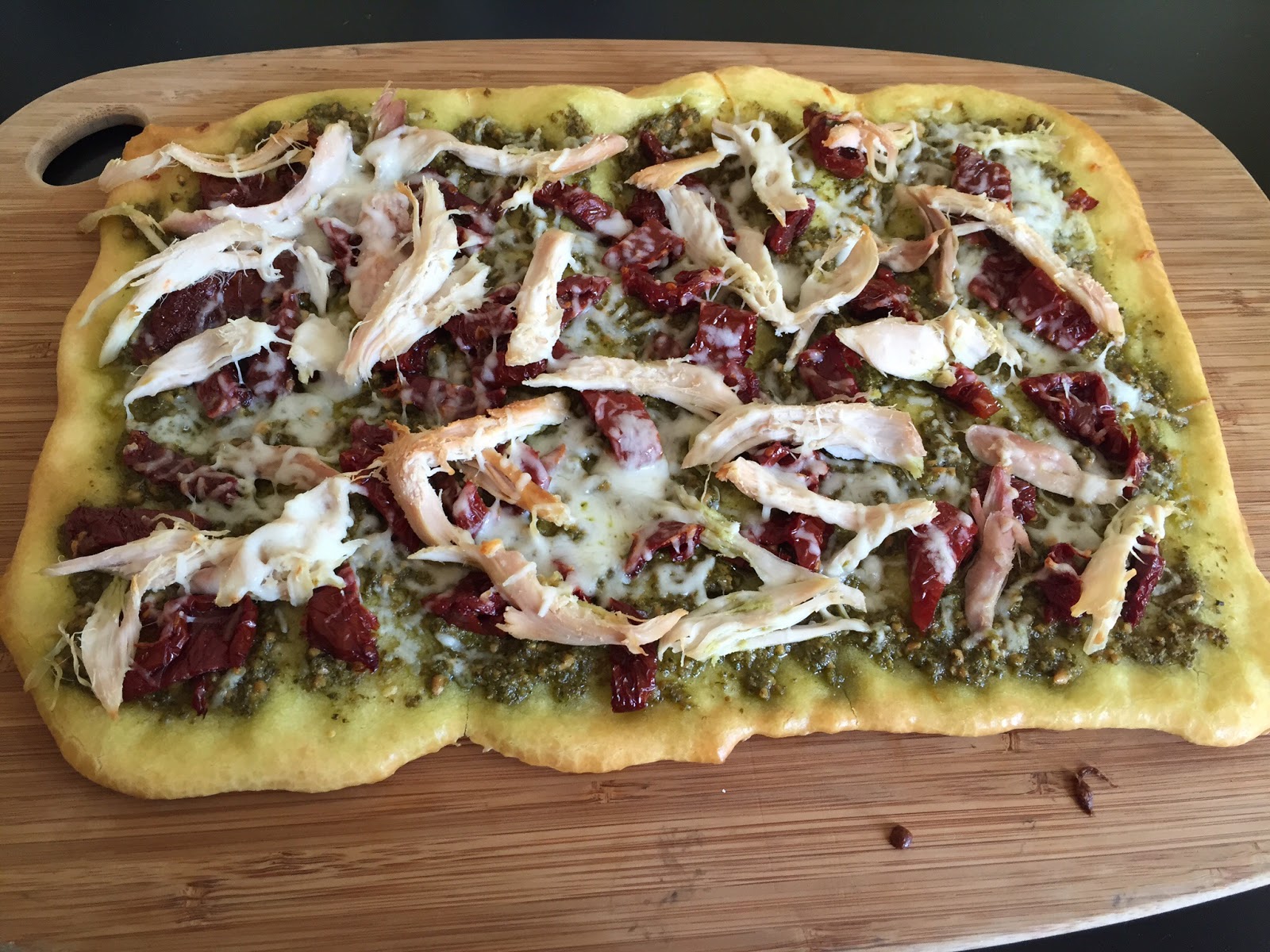 chicken....and then the cheese and pepper flakes if you are adding those!