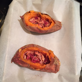 1. Poke holes in the sweet potatoes and bake them 60 minutes until they are cooked through.