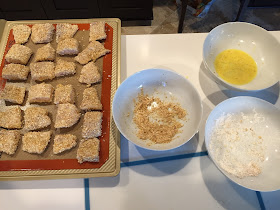 2. Like an assembly line: Dredge the fish in bowl 1, shake off the excess, dip into the egg mixture, dredge in the panko. Place each chunk on the cookie sheet. Spray with olive oil spray.