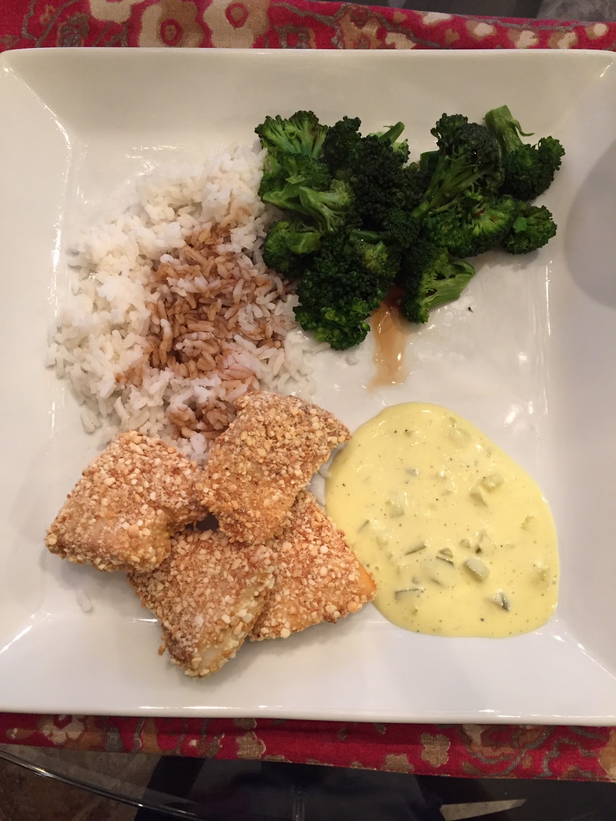 2. Like an assembly line: Dredge the fish in bowl 1, shake off the excess, dip into the egg mixture, dredge in the panko. Place each chunk on the cookie sheet. Spray with olive oil spray.