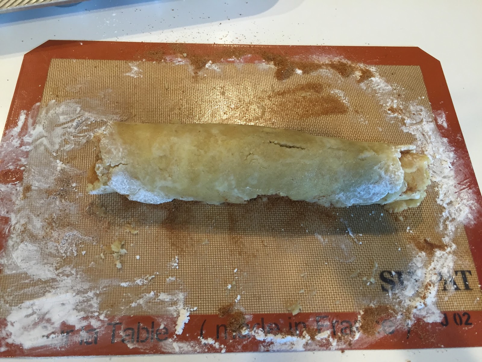 5. When the dough is chilled pull it out and take off the top layer of plastic. Brush it with the butter all the way to the edges. Sprinkle it with the cinnamon/sugar.