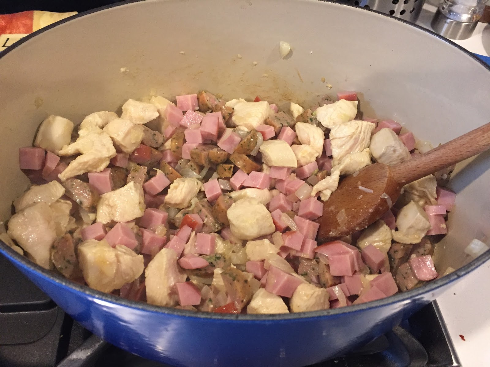 3. Add the ham, sausage ... stir....