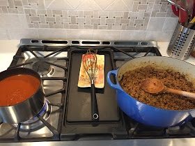 4. After the spices are fragrant, add the pineapple (with juice), the browned stew beef and all the cans of tomato products. Bring to a boil, reduce heat and simmer about an hour. Taste for salt.