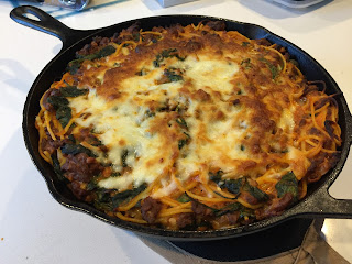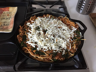 3. In a large bowl, whisk the eggs. Add the hot pasta and toss. Add the chorizo mixture and pasta sauce. In the same skillet, add another drizzle of oil and saute the spaghetti until it is wilted. Add that to the bowl as well as 1/2 cup cheese.