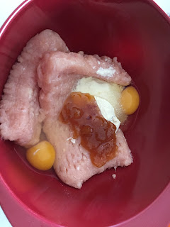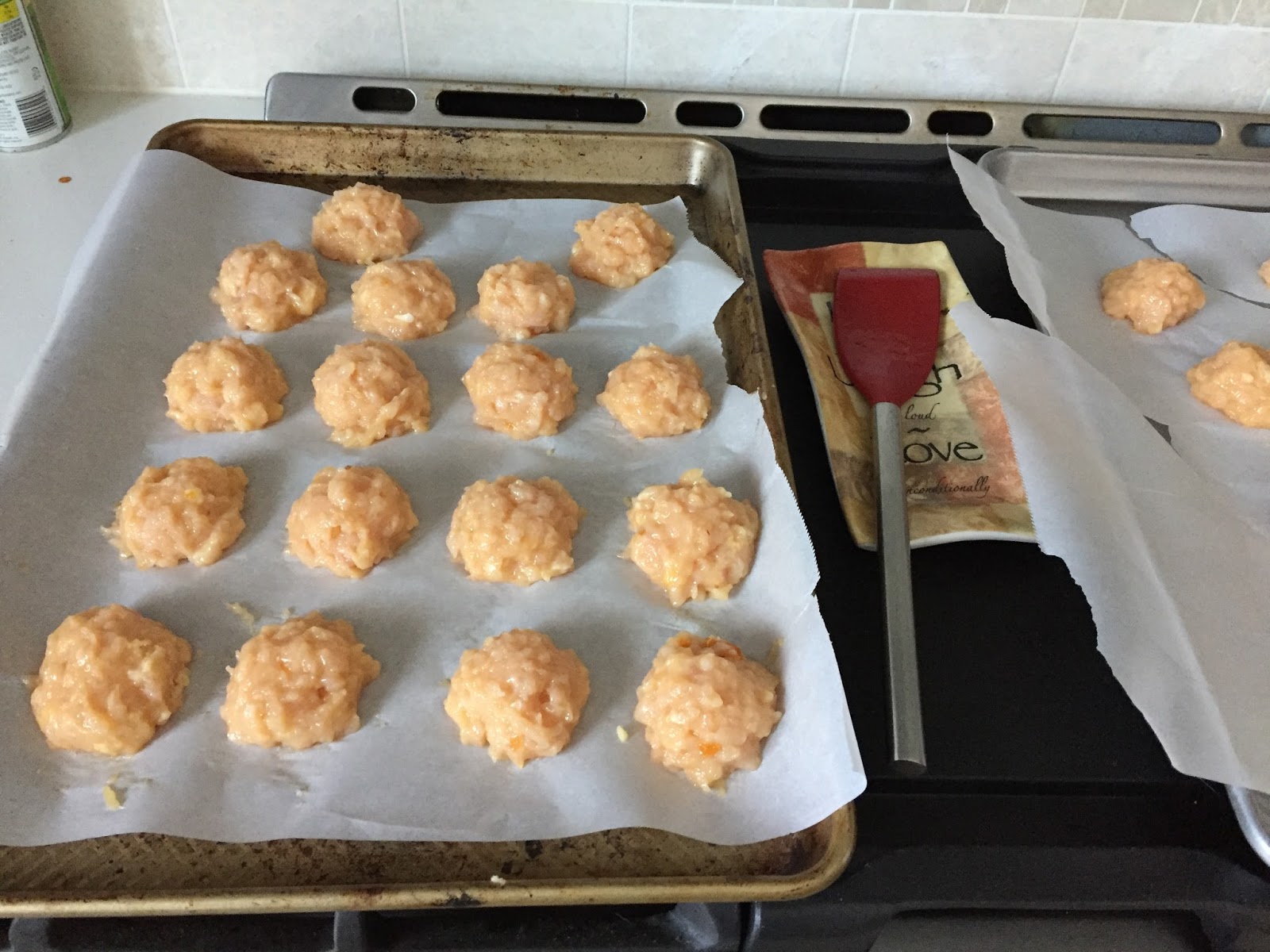 1. In a large bowl combine the chicken through chili sauce. Mix well with your hands. Drop tablespoon sized mounds onto a parchment lined baking sheet. They are "loose" looking and that's ok. I made 30 meatballs