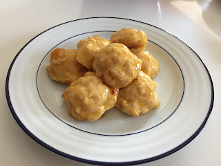 Beef stew in the crockpot was first, chop, put everything in, done. Next the chicken when in the oven because I needed it for other recipes. Then I started on the chicken meatballs (recipe below.) When they went in the oven I got my sweet chili sauce done and started on the spaghetti pie (recipe below.) Water boiling for the noodles and chorizo in the skillet sautéing- the meatballs came out and were tossed in the sauce, done. Spaghetti pie assembled and put in the oven, done. The chicken came out and I started on the two sauces I would need for the casserole (recipe below.) When those were done the chicken was cool enough to touch and so I cut all of it and assembled the casserole, done.Apricot Chicken Meatballs