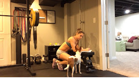 Almost to winter break- we can do it! Trying to keep moving even though I am tired and want to eat all the cookies. This time of year is rough. It would be easy to make excuses, but I have found that as much as I don't want to get up early, workout, meal prep, etc. I am so glad I did when I finish. On the outside I might look like I am doing pretty well- I am feeling great workout-wise, finally!, I am keeping my patience at work with students, and my home is fairly clean and decorated for the holidays. Reality- I am on the struggle bus- I am taking deep breaths to not lose it at home. I am so behind at work... this week, to justify working out, I graded lab reports in between squat sets. It reminded me of eating a cookie on a treadmill, stressing and de-stressing at the same time. I was videoing my squats to make sure I was at depth because weight is getting heavy, and captured this moment- Annie wanting to play fetch, Charlie in the background watching a show to give me 30 min of "me" time and grading next to my squat rack. This is life.