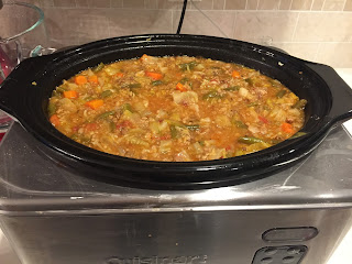 Brown the pork and beef, drain. Add everything to the crockpot, using only 4 CUPS of stock. Cook on High 5 hours, I stirred mine half way through. When it is finished add the other 4 cups of stock and taste for salt.