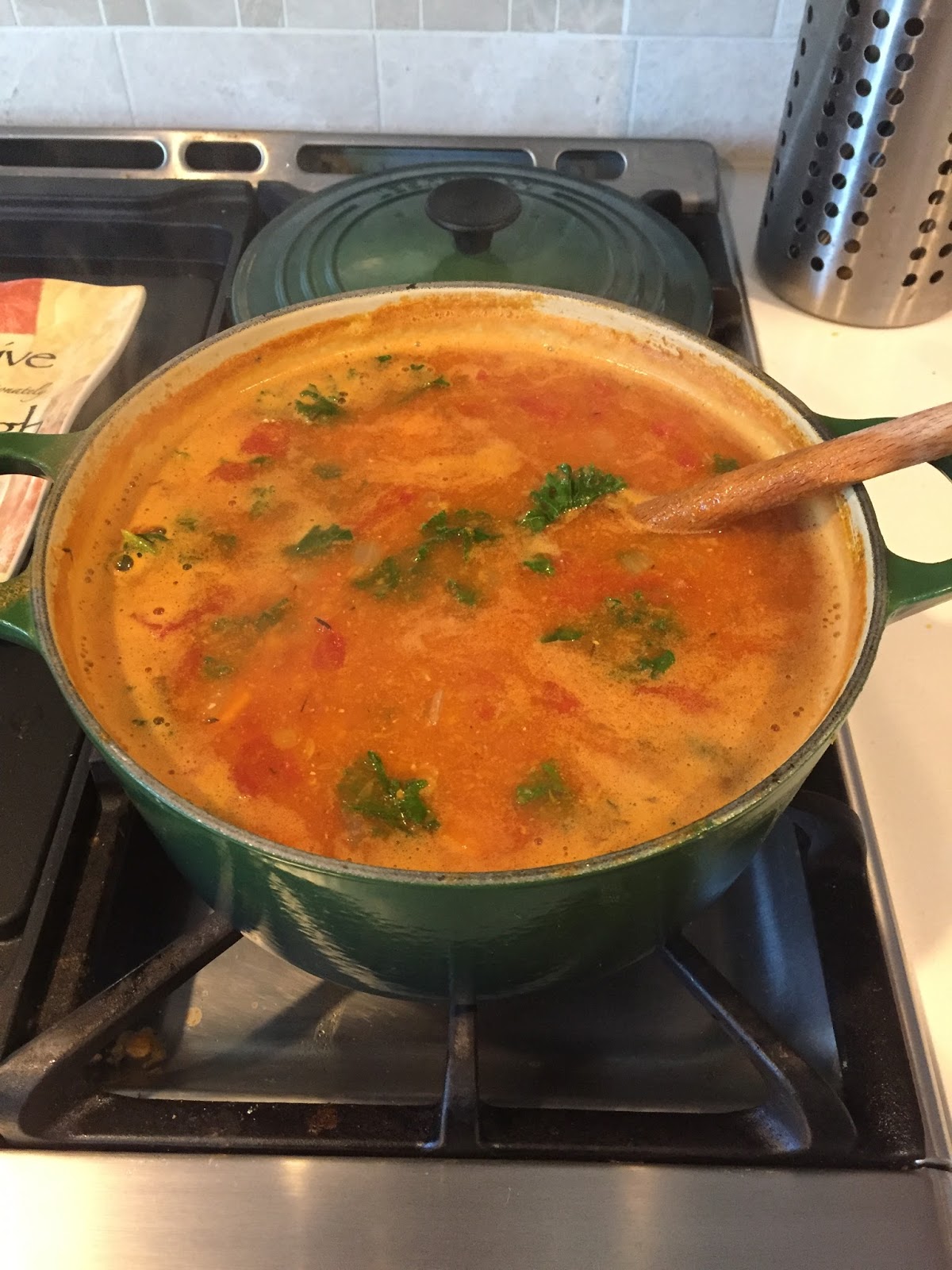 3. Transfer 2-3 cups to a blender. Using a towel over the top so you don't burn yourself, puree the soup and add it back to the pot. Add the kale and cook 5ish more minutes until it softens.