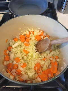 1. Heat the oil in a large dutch oven over medium heat. Add the onion, carrots and garlic. Saute until the onion is translucent, about 5 minutes.