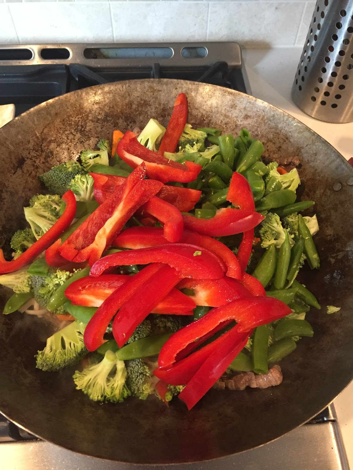2. Heat a large wok or skillet over medium high heat. Add the steak and cook until browned- 3-5 minutes. Add the veggies, cook another 3-5 minutes until tender, but not mushy.