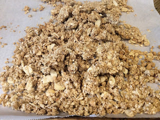3. Bake 18-20 minutes. At the half-way point, turn the granola in large sections if possible and press it together again. Take it out when it is slightly browned, it burns quickly and hardens as it cools so don't walk away! Once it has completely cooled, break it into pieces. I store mine in mason jars.