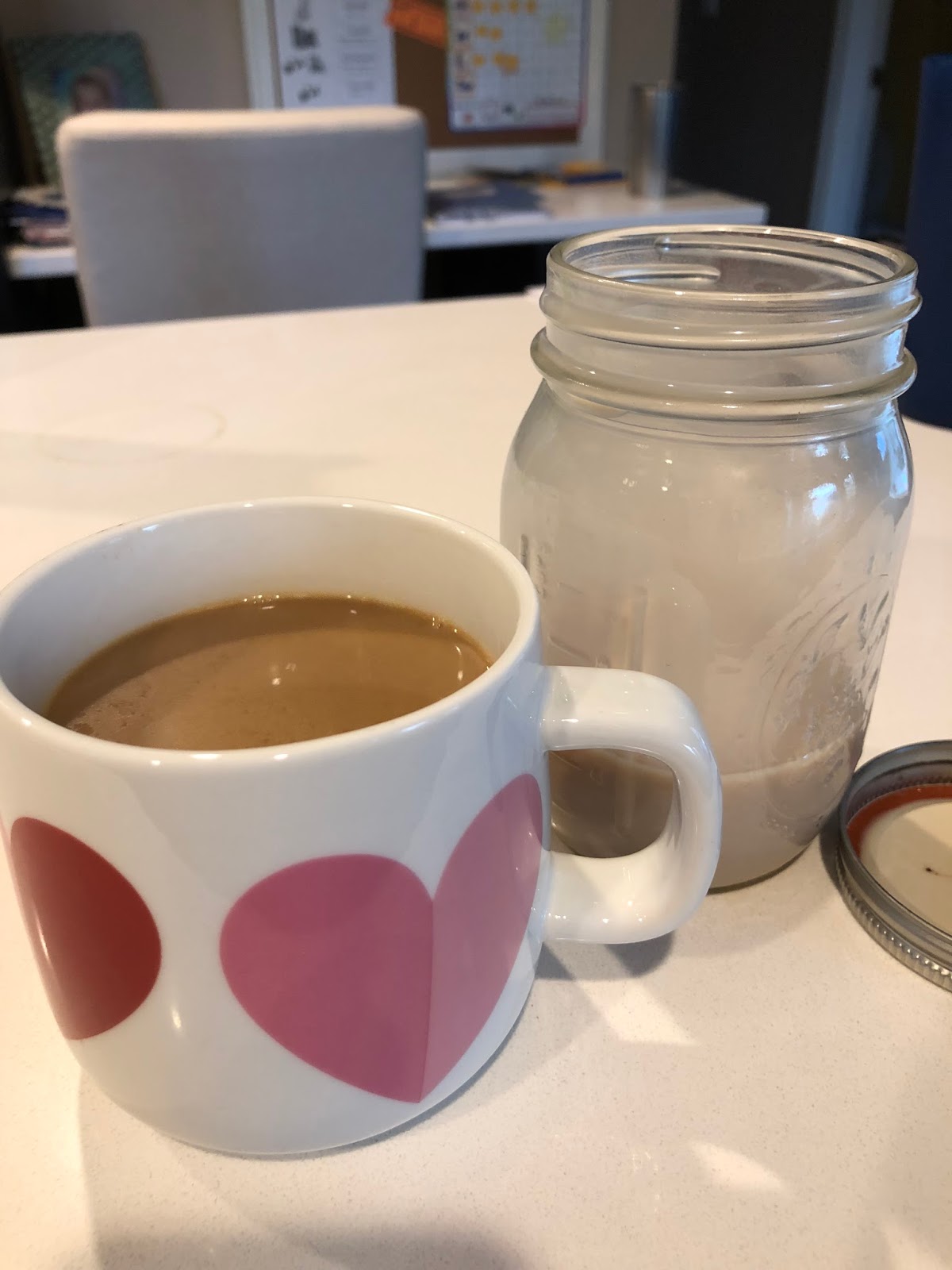 It is crazy how much you forget about babies! I am still adjusting to getting up every 1-2 hours in the night to nurse, then I get up before 6am to drop off Charlie at school in the morning, pump so I have milk for when I stop nursing, and attempt to make it to the gym or workout at home, all while keeping a newborn happy. Phew! It has been discovered that my typical egg and potatoes will not be happening for me right now, therefore I am looking for alternative options that combine my coffee need with my need for food and my lack of time. So here it is! My "wake-me-up" protein shake combining protein, carbs, and coffee... perfect to make, store in the fridge, and drink on the go so I can do everything that needs to be done for my two girls and me in the gym all before 9am.