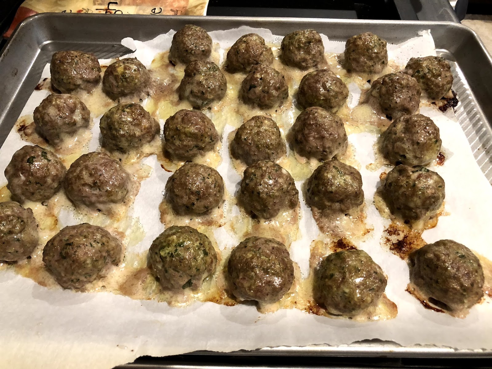 3. I use a tablespoon, but feel free to eye-ball, and start rolling your meatballs into a size a little smaller than a golf ball. Place them on a parchment lined cookie sheet. Bake for 23-25 minutes, or until they are firm to the touch and starting to brown on the top. Serve immediately, or let them cool completely and freeze....enjoy!