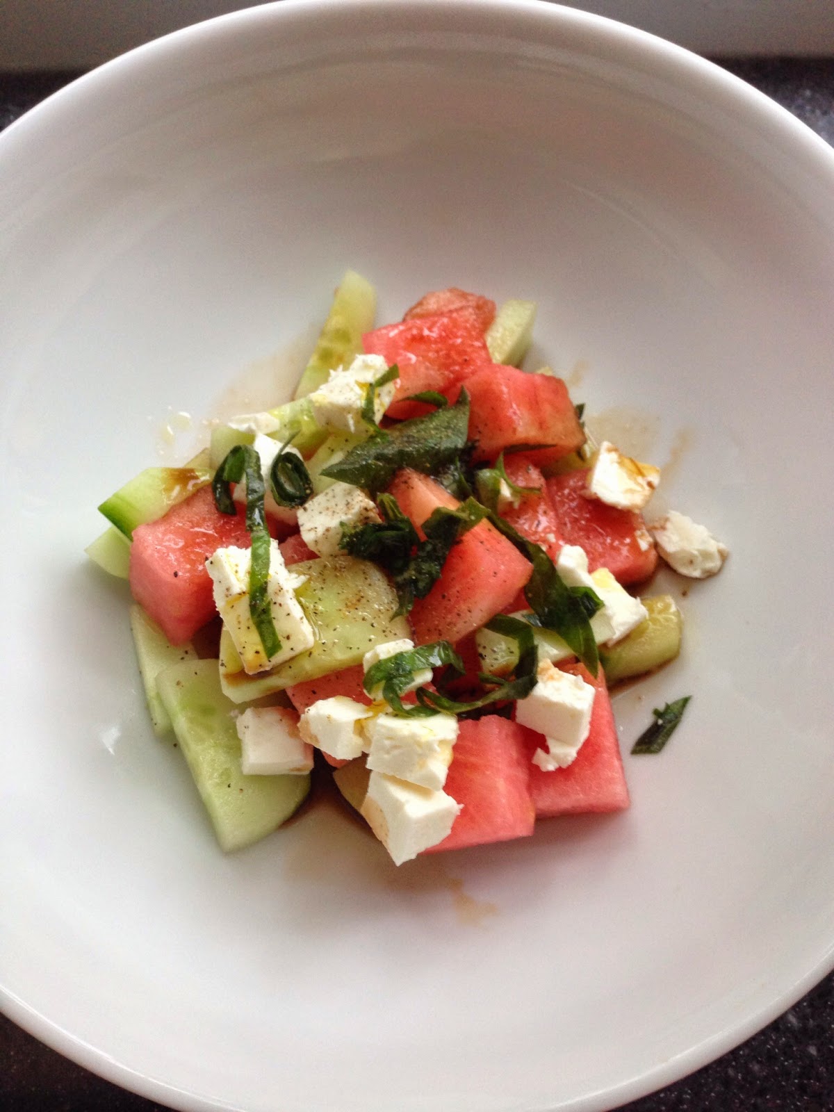 I don't particularly love watermelon, but my child does so I had some hanging around the house and I thought I would try and make a light snack with it- turns out feta and watermelon is fantastic and the cucumber just gives a different texture. There are not measurements with the "dressing" because it needs to be done just before eating, or per bowl, or else the color and taste are just, well, not good.