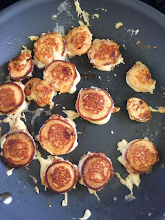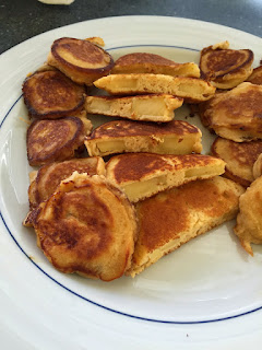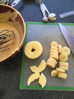 The idea for these pancakes came from the back of a bisquick box. They are a quick mid-week dinner or a weekend breakfast. I ate so many of the banana ones! You could really use any batter you like, but this is quick to put together and coconut flour is high in protein, fat, and fiber... more so than most other flours. It is also cheaper than almond flour and the pre-made gluten free baking mixes. If your batter starts to look too thick, add more milk or water.