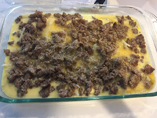 2. Grease a 9x13" pan. Sprinkle in the potatoes. Whisk the eggs and milk (cheese if adding). Add the cooked sausage. Pour the eggs/milk over the top. Let it sit in the fridge 2+ hours or overnight.